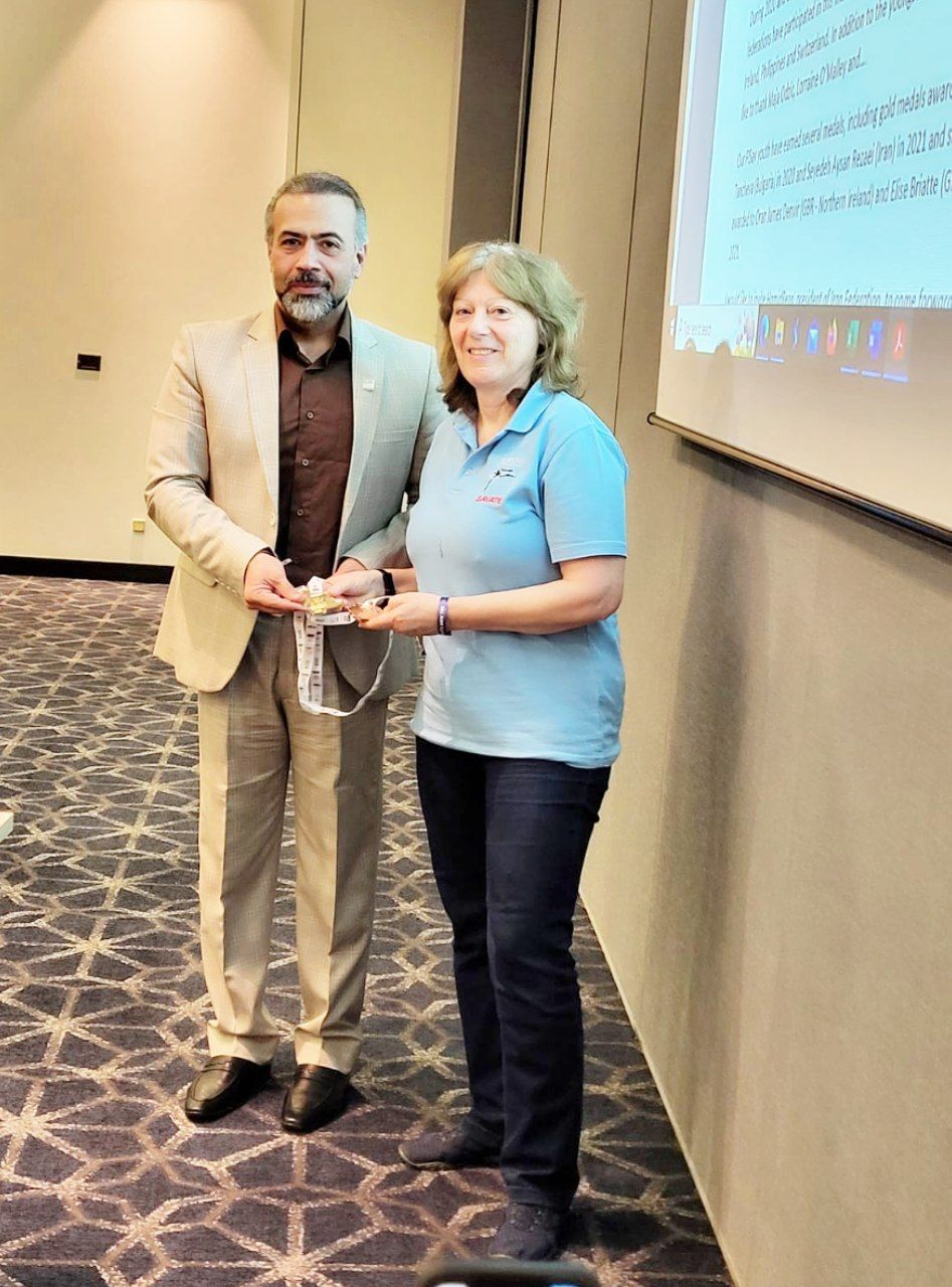 اهدای مدال های قهرمانی ساواتورهای ایران در مسابقات UTS توسط دکتر جولی گابریل رییس فدراسیون بین المللی ساواته به دکتر حمیدرضا حصارکی در حاشیه مجمع عمومی FISav در ایتالیا