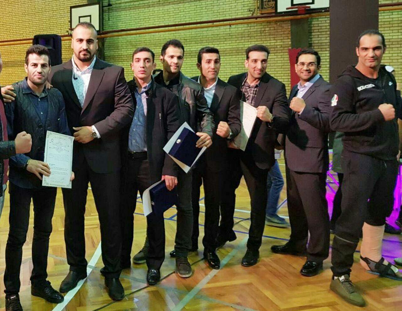 به ترتیب از راست به چپ: جمشید گیوه چی دارنده مدال نقره و نایب قهرمان جهان در سال 2017، محمد حمزه پور دارنده مدال برنز جهان در سال 2009، حامد متین فر دارنده مدال برنز جهان در سال 2010 و طلای آسیا 2022، حسین حیاتی دارنده مدال برنز جهان در سال 2017، مسعود عسکری دارنده مدال برنز جهان در سال 2012، علی جدیدی دارنده مدال نقره و نایب قهرمان جهان در سال 2015، سیدمهدی حسینی دارنده سه مدال برنز جهان در سالهای 2017، 2019 و 2023 و همچنین کمربند قهرمانی ساواته - پرو، حمزه مرادیان دارنده مدال برنز جهان در سال 2014، نقره جهان در سال 2016، برنز جهان در سال 2018، طلای آسیا در سالهای 2019، 2022 و 2023، طلای مستر شیپ در سال 2019 و مدال برنز کامبت گیمز 2023.