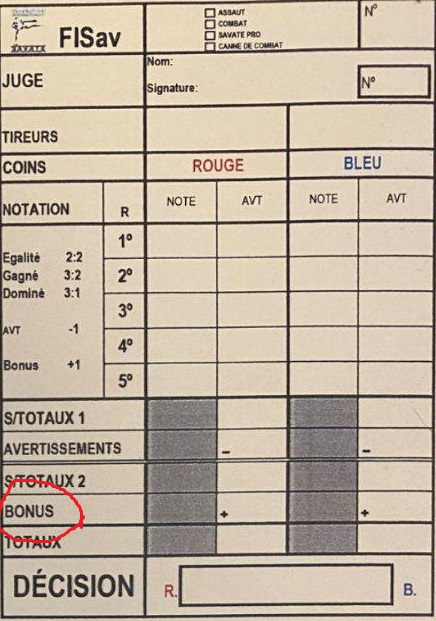 همچنین در انتهای برگه داوری بخشی با عنوان Bonus یا پاداش/جایزه در نظر گرفته شده است که در صورت تساوی دو ساواتور پس از محاسبه نهایی امتیازات در پایان سه راند رقابت های عادی یا پنج راند فینال مسابقات جهانی، داور کنار می تواند یک امتیاز Bonus را به فایتری که در مجموع به لحاظ نمایش تکنیکی، روح مبارزه، اخطار کمتر یا هر شاخصی فنی که از نظر داور کنار می تواند معیاری برای برتری کلی یک ورزشکار نسبت به حریفش باشد، به آن ساواتور اختصاص داده و همین یک امتیاز برتری باعث برد ورزشکار شود.